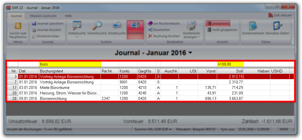 Oft möchte man in der aktuellen Buchungsliste, z.B. dem Journal oder dem Kassenbuch, eine bestimmte Buchung suchen. Bisher musste dafür die Suchfunktion aufgerufen werden. Mit EAR 22 haben wir in vielen Masken die Direktsuche und den Direktfilter integriert. Damit erhalten Sie oberhalb der Buchungsliste eine Eingabezeile und können ein oder mehrere Kriterien zur Suche oder Filterung der Buchungsliste eingeben. Bei der Direktsuche werden alle Zeilen markiert, die den Kriterien entspechen, beim Direktfilter werden dagegen alle Buchungen ausgeblendet, die nicht den Kriterien entsprechen.
