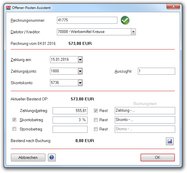 Die Zahlung offener Posten ist bei vollständiger Zahlung recht einfach. Anhand der Rechnungsnummer können Zahlungen automatisch den Rechnungen zugeordnet werden. Komplizierter wird es, wenn bei der Rechnung Skonto abgezogen wurde oder ein Teil der Rechnung storniert werden muss. Hier hilft künftig der Offene-Posten-Assistent. In der Spalte "Buchungstext" der Buchungsmaske drücken Sie Strg+O zum Öffnen des Assistenten und geben dann die Rechnungsnummer ein. EAR sucht automatisch nach der passenden Rechnung und Sie müssen nur noch den Zahlungs, Skonto und/oder Stornobetrag eingeben. Das Beste dabei: Der Skontobetrag kann auch prozentual eingegeben werden. Sie legen als Standard z.B. 3% Skonto fest und lassen EAR den Restbetrag als Zahlung buchen. Die Buchungskonten für Zahlung, Skonto und Storno ermittelt EAR ebenfalls selbst, Sie können diese jedoch auf Wunsch anpassen.