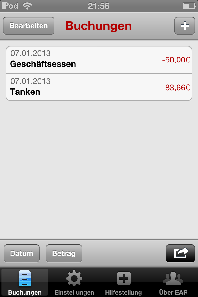 Die EAR-App ermöglicht es auch unterwegs schnell und unkompliziert Buchungen zu erfassen. Bewirtungs- oder Tankenrechnungen sind genauso schnell erfasst wie der nebenbei besorgte Kaffee für's Büro oder der neue Drucker. Aber auch wenn eine einzelne Buchung bei sofortiger Eingabe in wenigen Sekunden erledigt ist spart die Summe aller mobilen Buchungen bei der Monats- oder Quartalsbuchhaltung eine Menge Zeit.